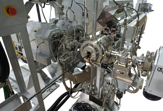 - Highly accurate discharge rate control with three extruders and gear pumps allows varying layer thickness and different flexibility settings for each section of tubing.